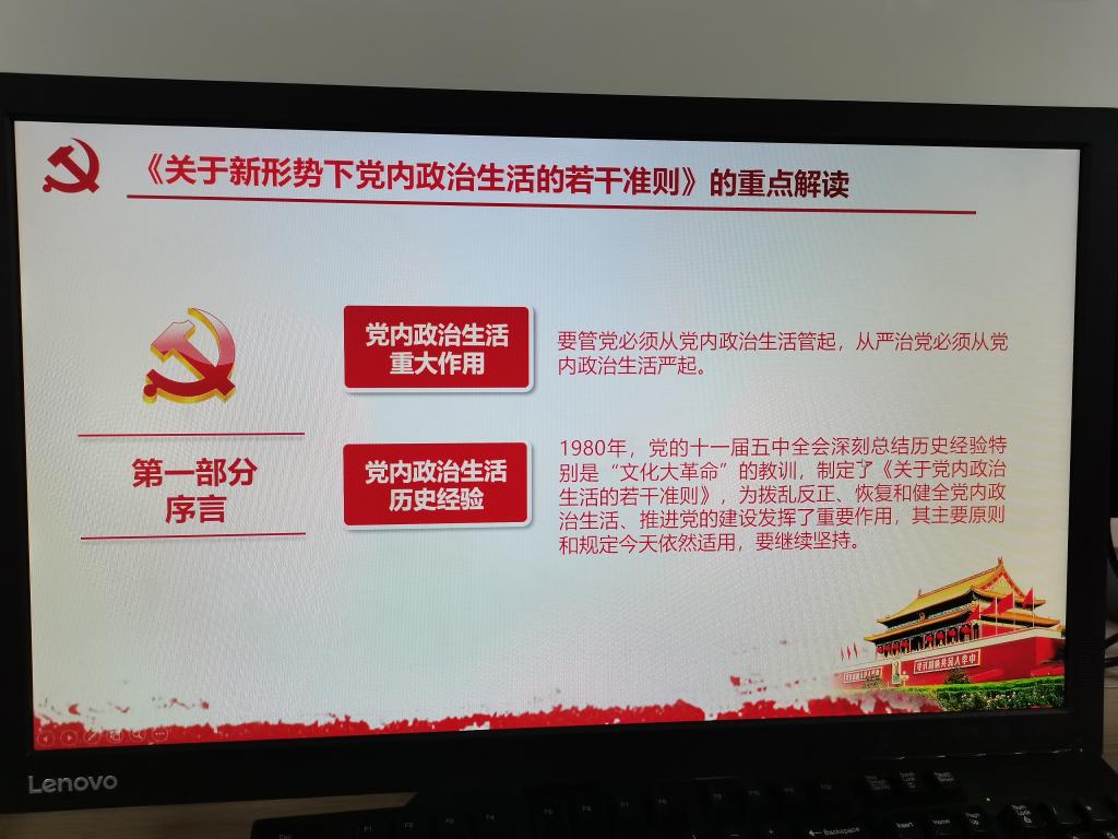 各支部组织全体党员集中学习了《新形势下党内政治生活若干准则》,对党内政治生活存在的突出问题、新形势下加强和规范党内政治生活的要求,以及对坚定理想信念、坚持党的基本路线等十二个方面进行学习研讨,强调办好中国的事情,关键在党要管党、从严治党。要把严肃党内政治生活作为推动全面从严治党向纵深发展的基础性工程,加快推动党内政治生活全面回归健康规范的轨道。之后,集中学习了习近平总书记2022年3月5日在参加内蒙古代表团审议时讲话精神,强调坚持党的全面领导是坚持和发展中国特色社会主义的必由之路。只要坚定不移坚持党的全面领导、维护党中央权威和集中统一领导,我们就一定能够确保全党全国拥有团结奋斗的强大政治凝聚力、发展自信心,集聚起守正创新、共克时艰的强大力量,形成风雨来袭时全体人民最可靠的主心骨。