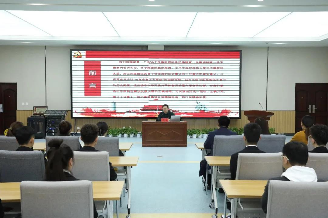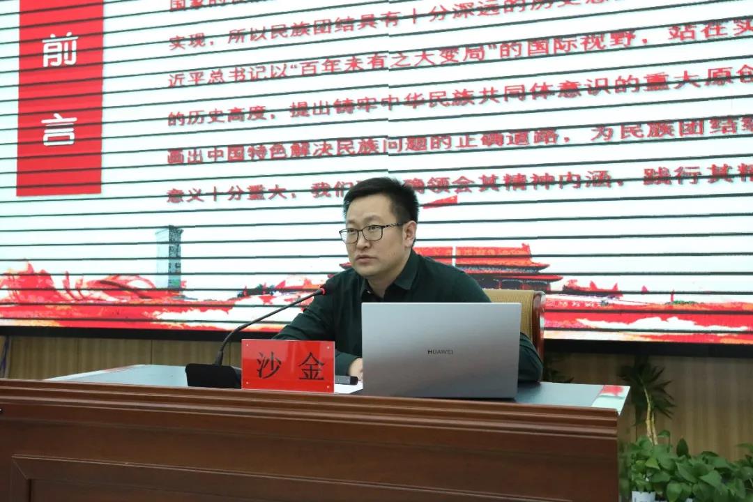 3月12日,买球官方网站在学生事务中心一楼报告厅举办铸牢中华民族共同体意识专题讲座。学院党委副书记、副院长沙金以“铸牢中华民族共同体意识共圆伟大中国梦”为主题,给买球官网全体辅导员、学生干部上了一堂生动的民族工作理论课。