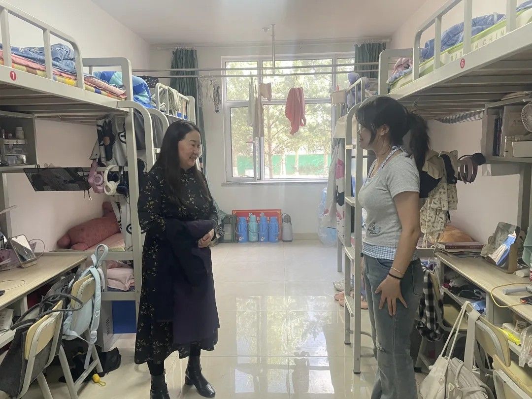 走访过程中,乌日其木格书记与学生亲切交谈,询问了同学们的学习生活情况并表示同学们要加强自我防范意识,自觉遵守宿舍各项管理规定,坚决杜绝宿舍内违规用电等违纪行为。同时保持环境整洁,注意开窗通风,预防感冒,共同营造安全有序、干净整洁的宿舍生活环境。