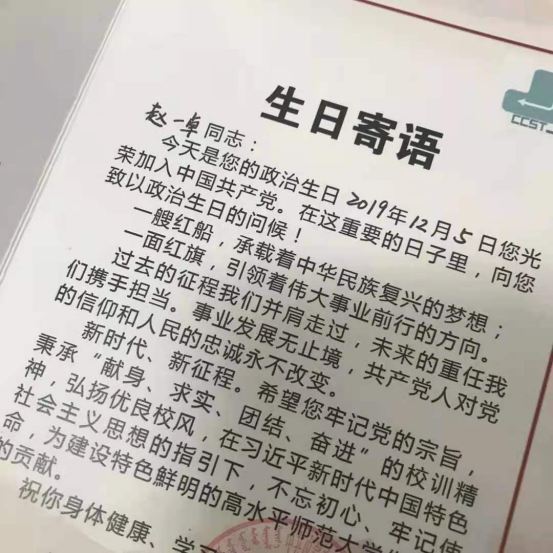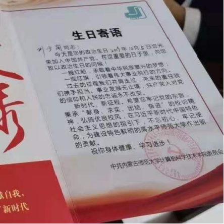 网络与通信系学生党支部书记白洋同志向罗姗姗、刘晓磊、郭家乐、刘少洵、王晓敏、李昊洋、吕华、袁文哲、宝馨、史轶伦、王凯铎、刘浩然12位同志赠送政治生日贺卡。