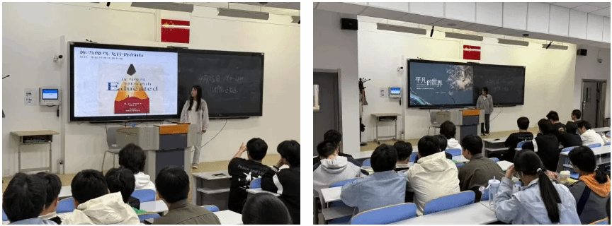 在读书分享环节,同学们依次登场。第一位同学分享了《活着》,从福贵的一生切入,富贵从风光少爷到孤苦老人,命运的打击接踵而至。亲人一个个离去,他却依然坚韧地活着。最后告诉我们,活着本身就是希望,哪怕生活布满苦难,也要带着对生命的敬畏,在苍凉中坚守那一份生的力量。第二位同学分享了《你当像鸟飞往你的山》,大家被塔拉的蜕变深深震撼。她挣脱原生家庭的桎梏,在教育中重塑自我,从封闭山谷走向广阔世界。最后一位同学将目光聚集在了《平凡的世界》,孙少安、孙少平兄弟在贫瘠土地上,用双手和坚韧对抗命运。书中满是生活的苦难与无奈,却也处处闪耀着人性的光芒。平凡人也能在时代浪潮中,以不屈不挠的精神,书写属于自己的壮丽篇章。